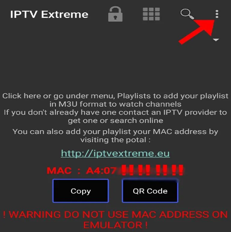 Una vez dentro de la aplicación, busca y haz clic en los tres puntos verticales (o un icono de menú similar) ubicados generalmente en la esquina superior derecha de tu pantalla. Este botón desplegará el menú principal de opciones de IPTV Extreme.
