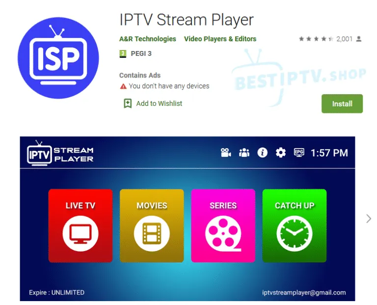 Instala la aplicación: En la página de resultados de búsqueda, localiza la aplicación IPTV Stream Player Official y toca el botón “Instalar”. La aplicación se descargará e instalará automáticamente en tu dispositivo.